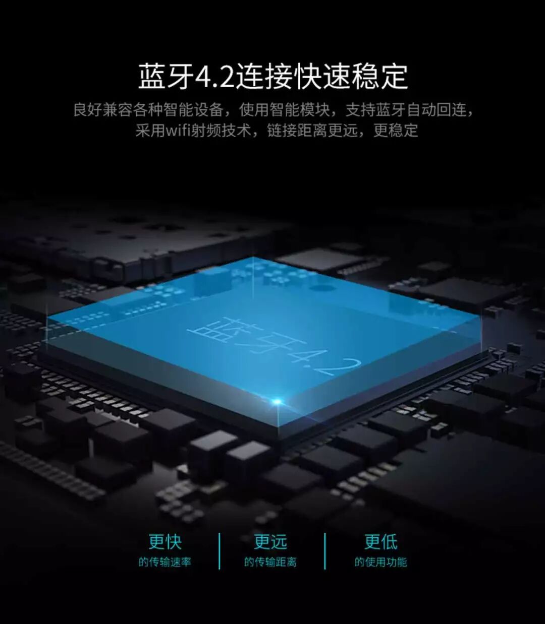 蓝牙4.2技术,能自动回连,避免重复识别连接的麻烦,回连时有语音提示,方便易懂。接收距离远,亲测9米左右中间有阻隔会断续,7米之内声音稳定畅通无阻。但是走进无线信号强的房间,蓝牙会一点干扰。